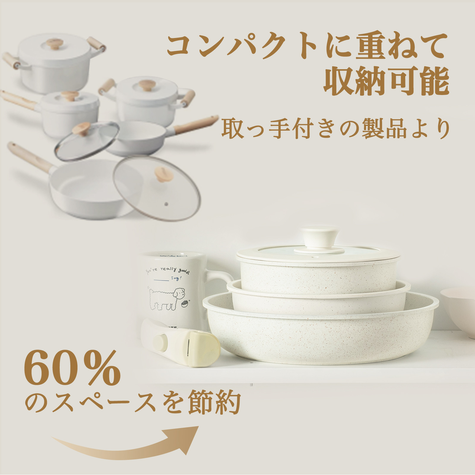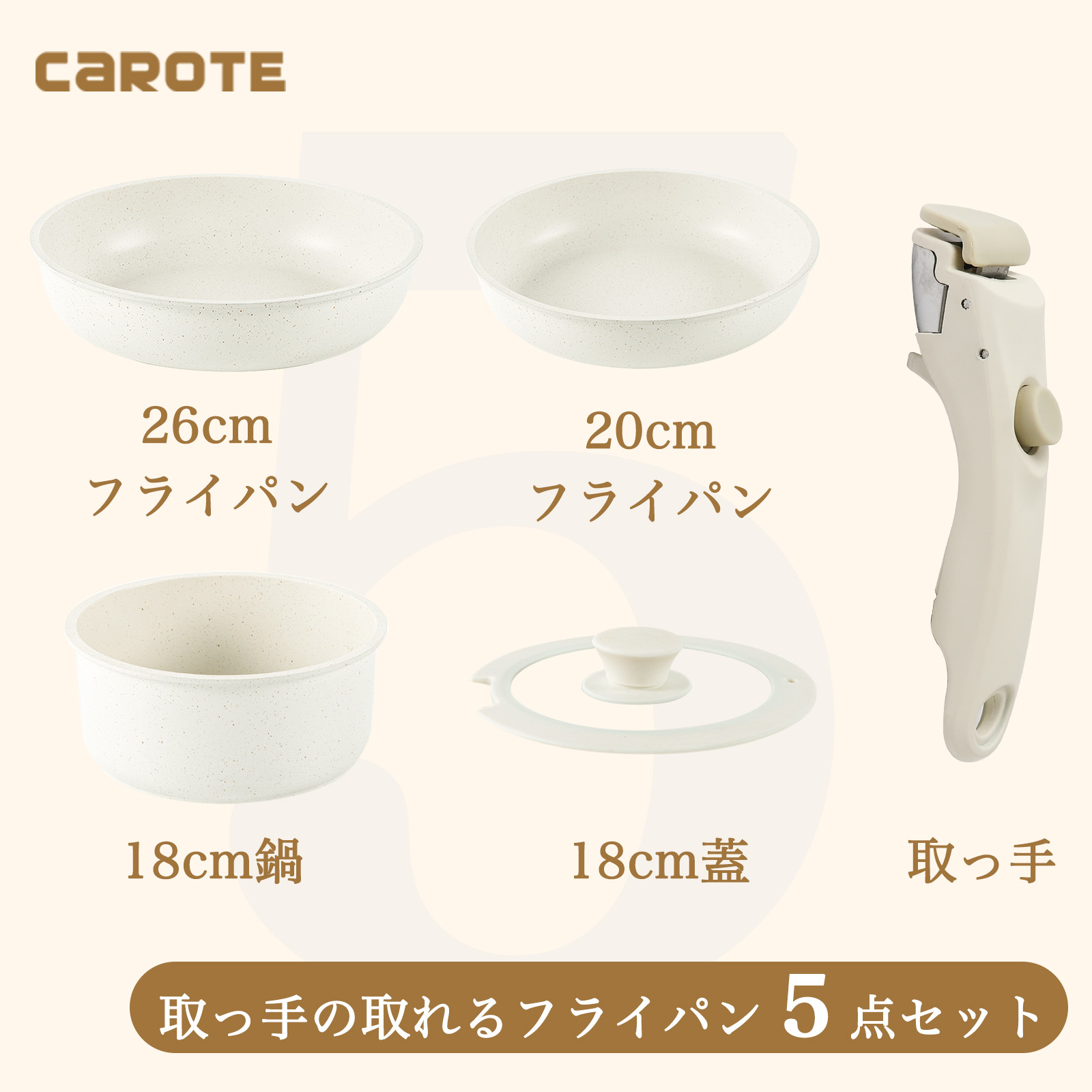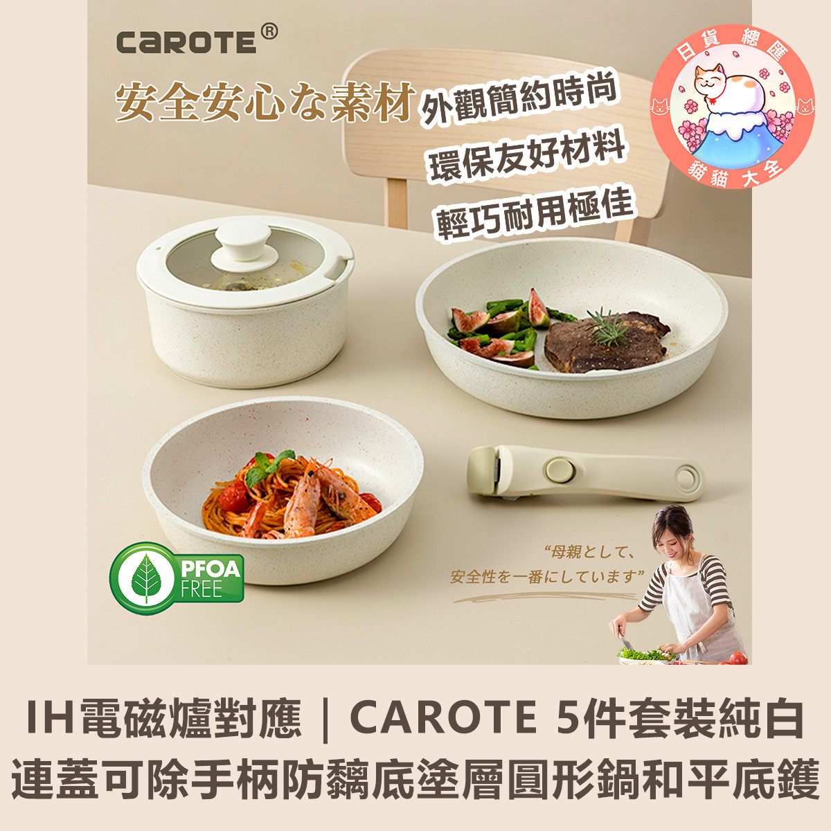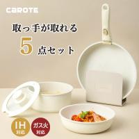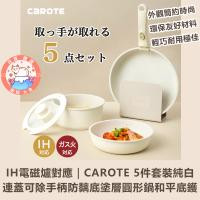 IH電磁爐對應|CAROTE 5件套裝純白連蓋可除手柄防黐底塗層圓形鍋和平底鑊